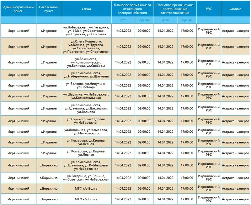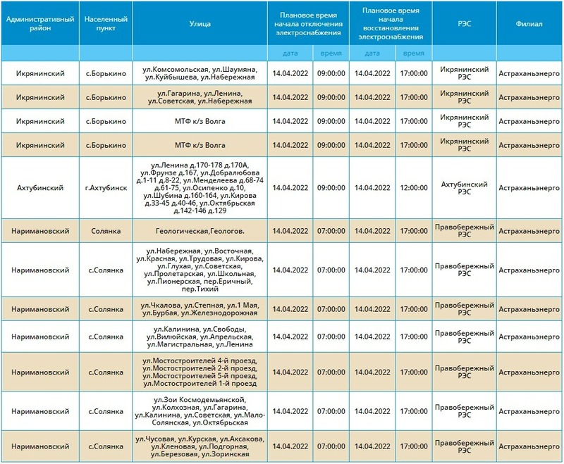 По информации компании «Россети Юг», 14 апреля плановые отключения затронут город Астрахань, Харабалинский, Ахтубинский, Икрянинский и Наримановский районы. Специалисты закончат работы в светлое время суток.