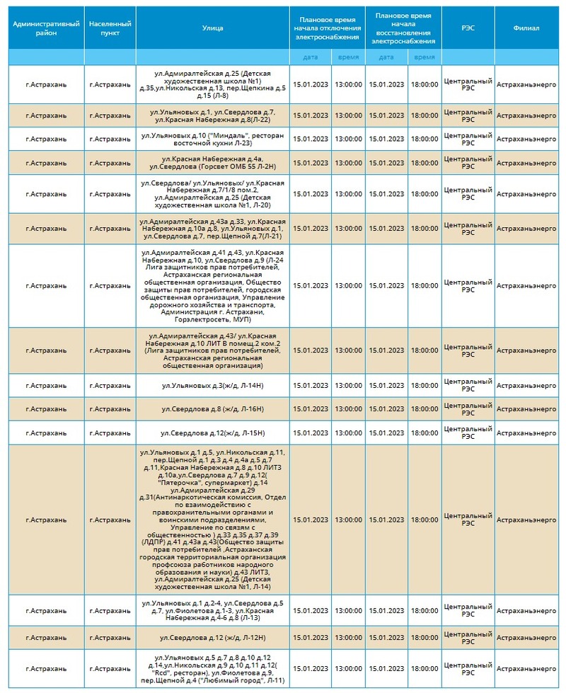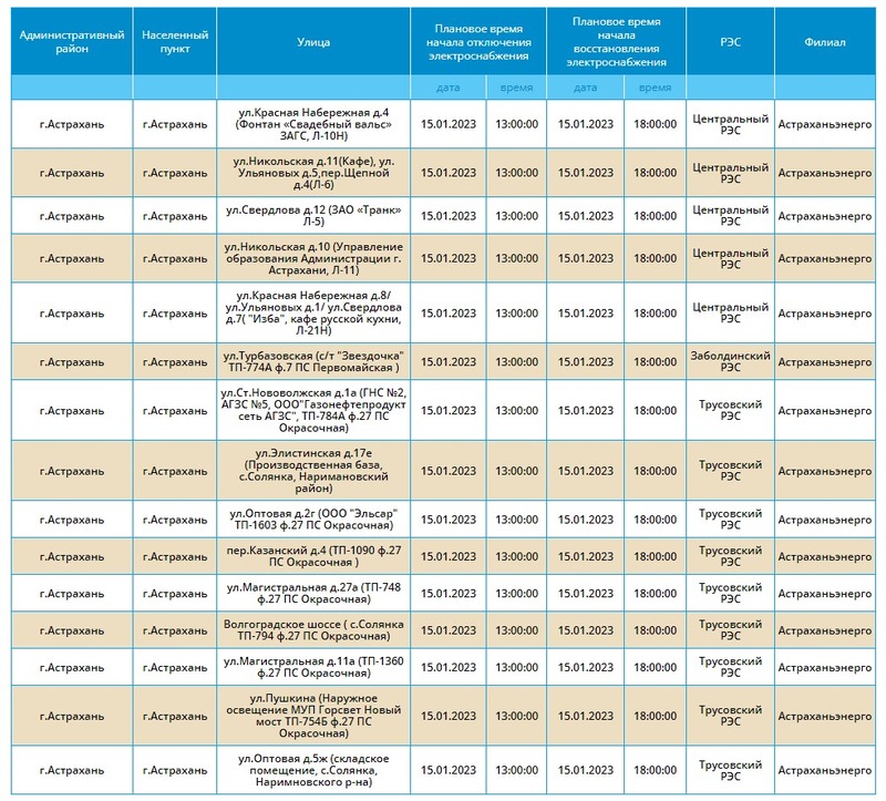 Ознакомиться с адресами и временем отключения можно в таблицах: