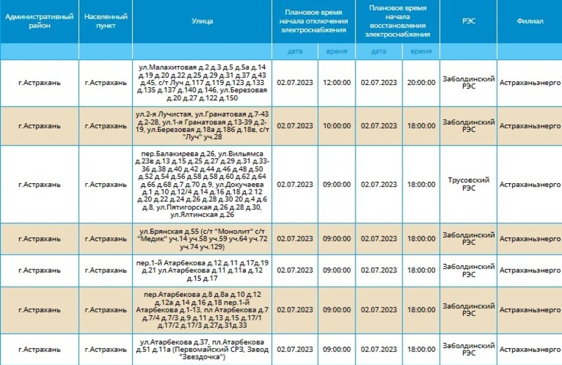 Ознакомиться с адресами и временем отключения можно в таблице:
