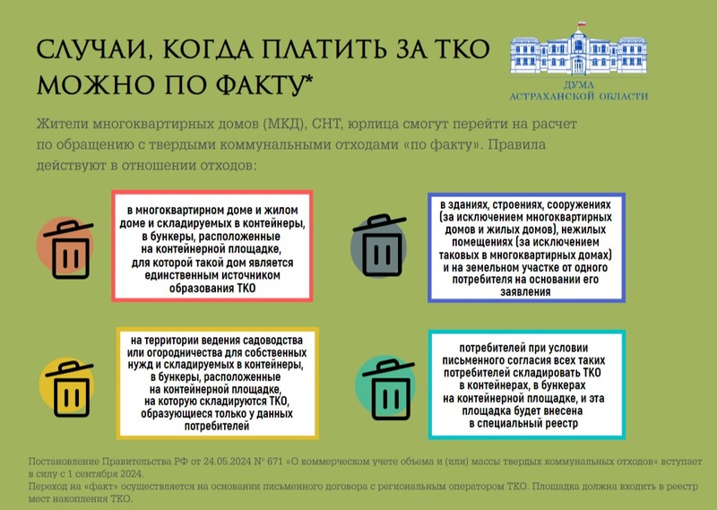 Новые правила предусматривают возможность перехода на расчёт по обращению с ТКО «по факту» для различных категорий потребителей, в том числе жителей многоквартирных домов (МКД), СНТ, юридических лиц. Расчёты по нормативам — это база, но есть прямо прописанные случаи, когда потребитель может требовать перехода на «факт», и ему нельзя отказать. Например, когда к контейнерной площадке привязан один потребитель. Также в правилах закрепили, что переход на «факт» осуществляется на основании письменного договора, пояснили в РЭО.