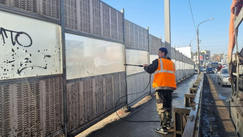 Так, 14 марта сотрудники МБУ «Мосты и каналы» при помощи аппаратов высокого давления начали помывку шумовых экранов на путепроводе Вокзальном.